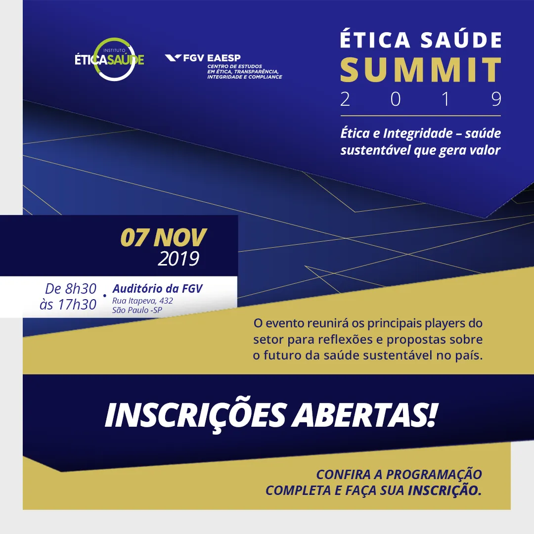 ‘Combate à corrupção, defesa da transparência e implantação de programas de integridade: peças fundamentais para uma saúde sustentável’. Este será o tema de abertura do Ética Saúde Summit 2019, organizado em parceria com a FGVethics. A secretária de Transparência e Prevenção da Corrupção da Controladoria Geral da União (CGU), Claudia Taya, dará a visão do Brasil e a Senior Policy Advisor U.S. Department of Commerce, Lynn Costa, a visão dos Estados Unidos. O evento vai acontecer no dia 7 de novembro, das 8h30 às 17h, no auditório da FGV, em São Paulo. As inscrições já podem ser feitas pelo site https://eticasaude.org.br/Eventos/EventoDetalhe/233. As vagas são gratuitas e limitadas.