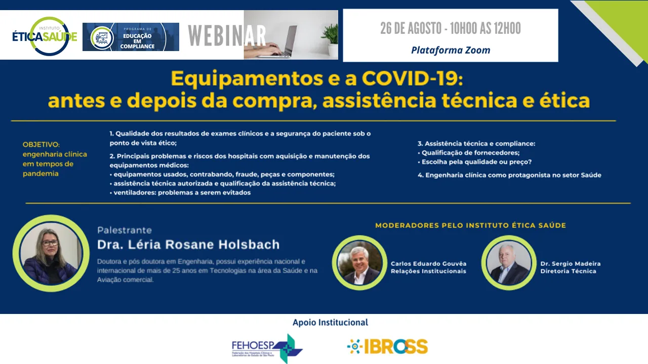 O webinar “Equipamentos e a COVID-19: antes e depois da compra, assistência técnica e ética” teve o apoio institucional da Federação dos Hospitais, Clínicas, Casas de Saúde, Laboratórios de Pesquisas e Análises Clínicas e Demais Estabelecimentos de Serviços de Saúde do Estado de São Paulo (FEHOESP) e do Instituto Brasileiro das Organizações Sociais de Saúde (IBROSS).
